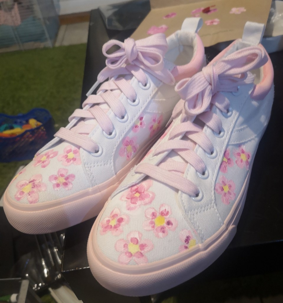 In the examples here I have used 2 different methods. The pink and yellow laced pumps I used acrylic paint to create the little blossoms. With a rounded brush I loaded it with paint and made delicate blobs of light pink in a circle to create the petals, I then daubed the darker pink in the same pattern towards to centre of the flower. I repeated this until I had a number of flowers that evenly coated the shoe. I let the pink paint dry, cleaned off my brush and then added the yellow spot in the middle. I soaked the laces in a red dye mix, I did this for a very short time so that they rinsed out to a light pink shade to match the detail of the blossoms. I then painted the opening of the shoe and the sides of the soul pink to match. So girly and pretty.