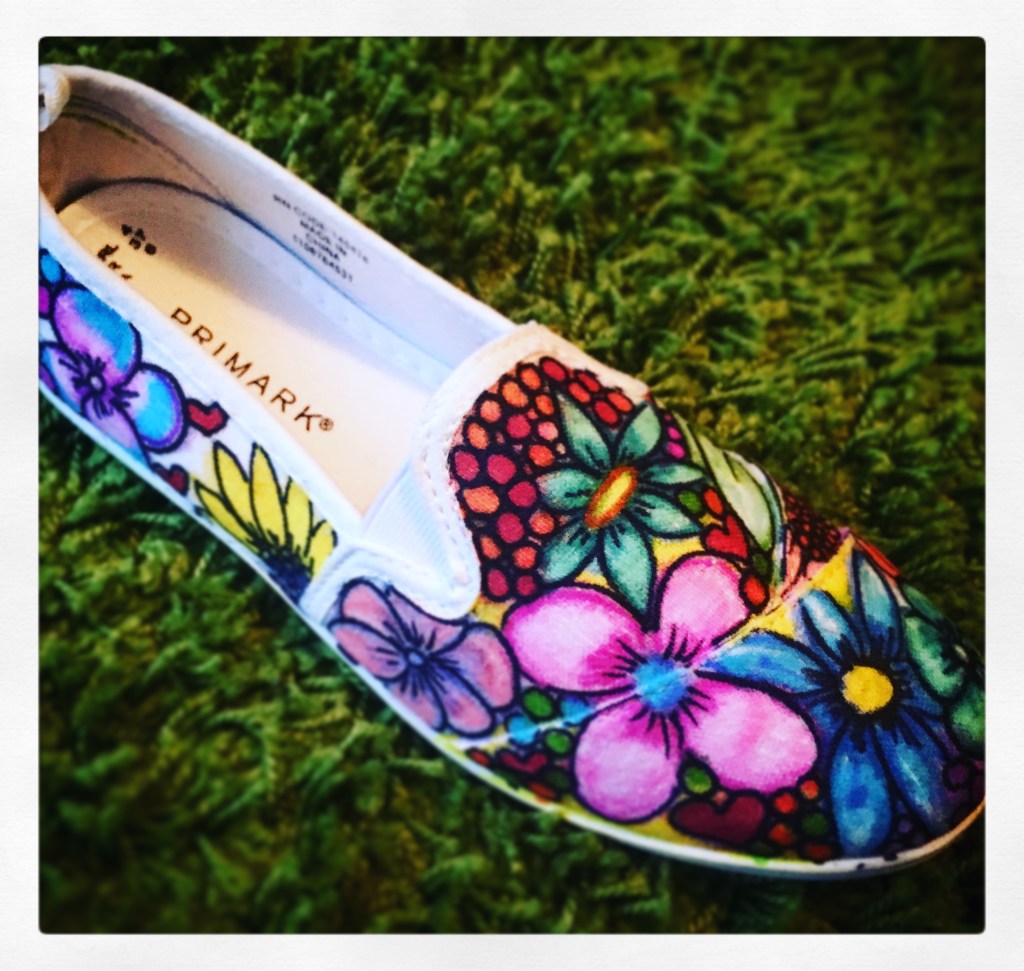 For the bandage-style, Flower Power Pumps, I used permanent markers for the design. I lightly drew in the outlines with pencil and then layered over this with black marker. I then filled the pattern with colourful marker pens, even adding shading with slightly darker shades.