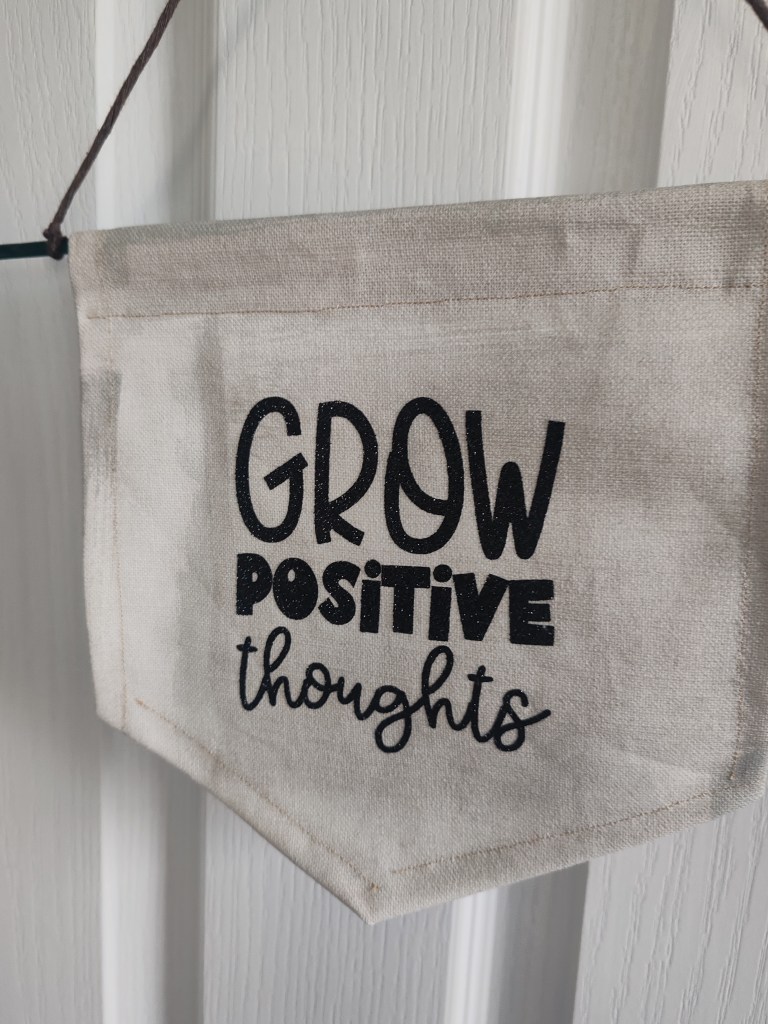 I used my Cricut Maker 3 and Cricut Design Space to design and cut the vinyl phrases from heat transfer vinyl and used a mini heat press to transfer them to my fabric.