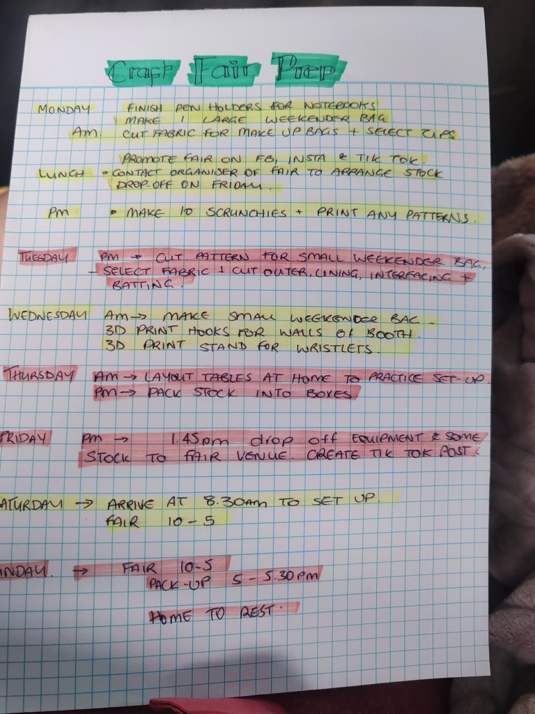 When you see a bustling craft fair stall filled with colourful bags, purses, banners, and handmade treasures, it can be easy to imagine that it all just “comes together.” In reality, there’s a whole lot of behind-the-scenes work that goes into making each fair a success. As a full time carer, I have to be pretty organised in any spare second I have in order to have military precision when setting up my stall.